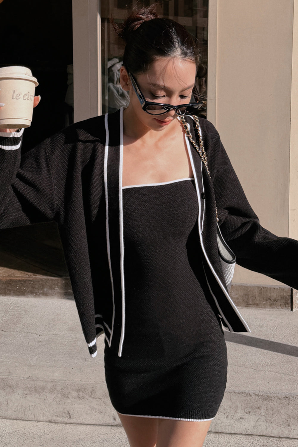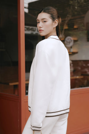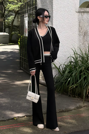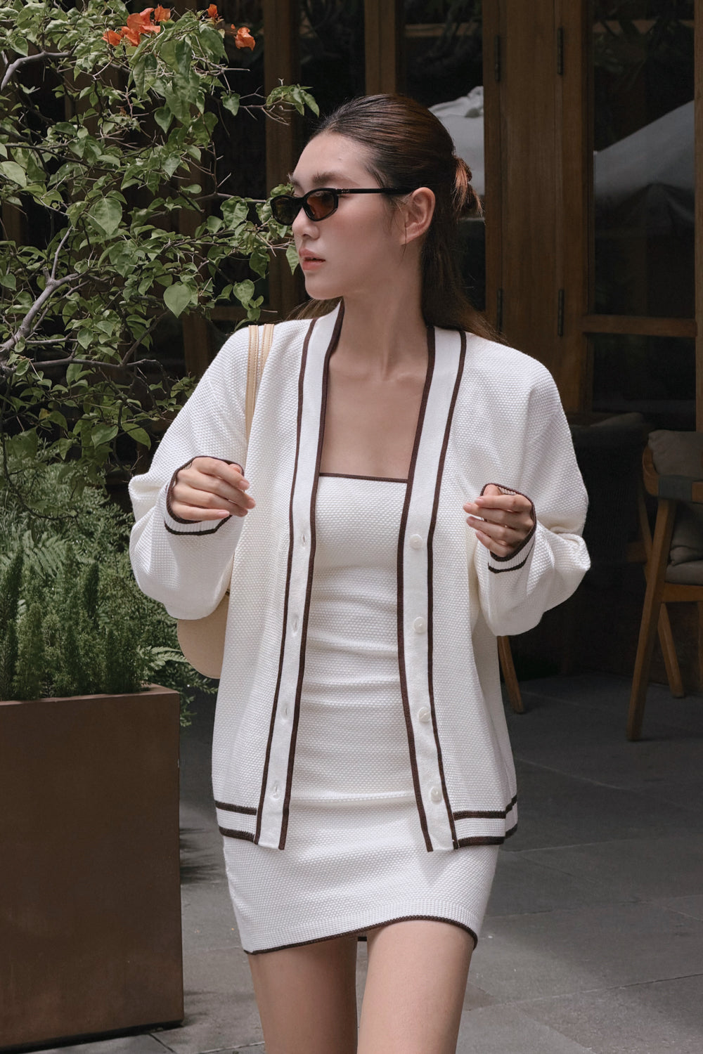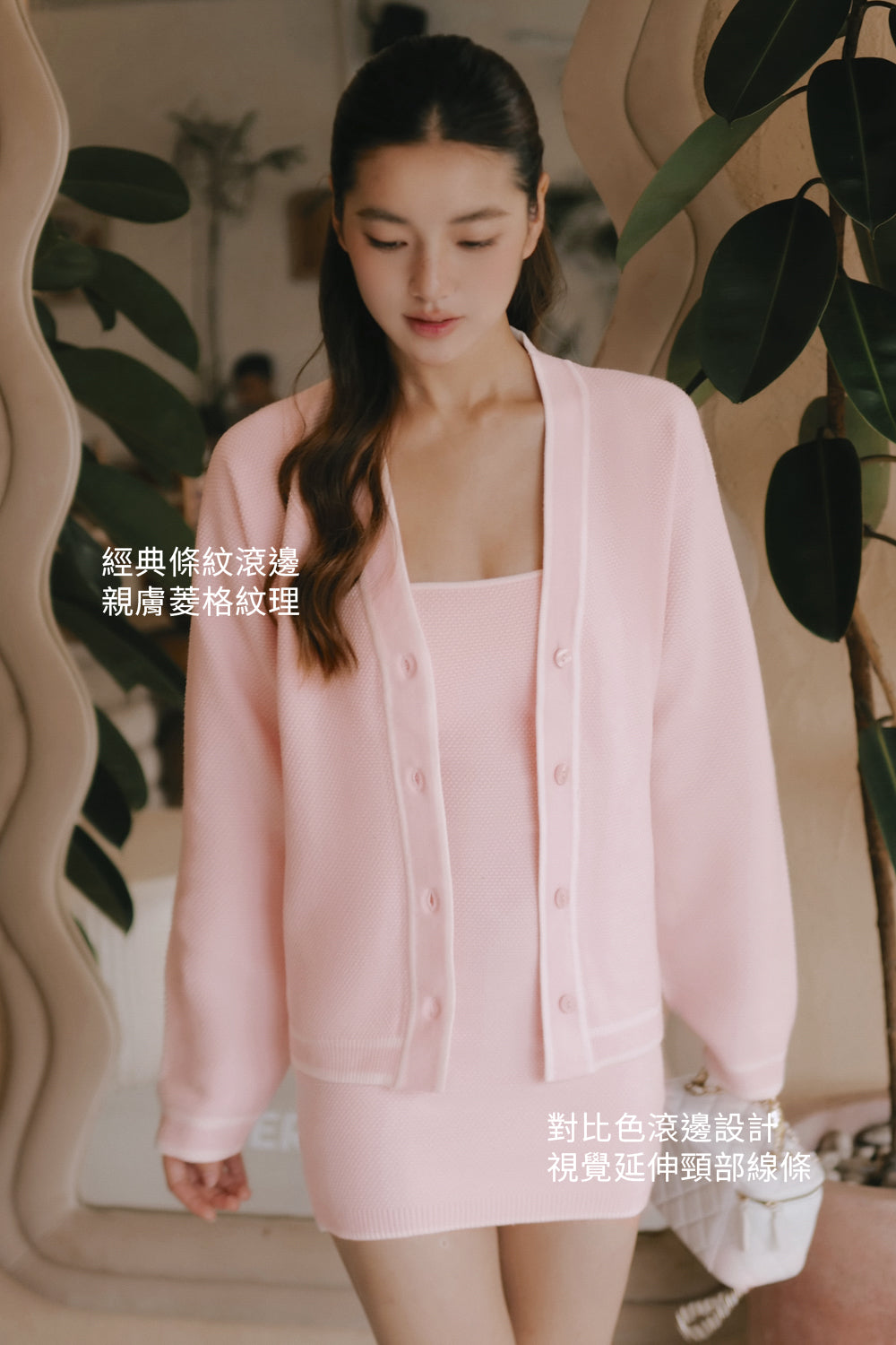 Afternoon Walk Tuck-Stitch Knit Contrast Trim Cardigan