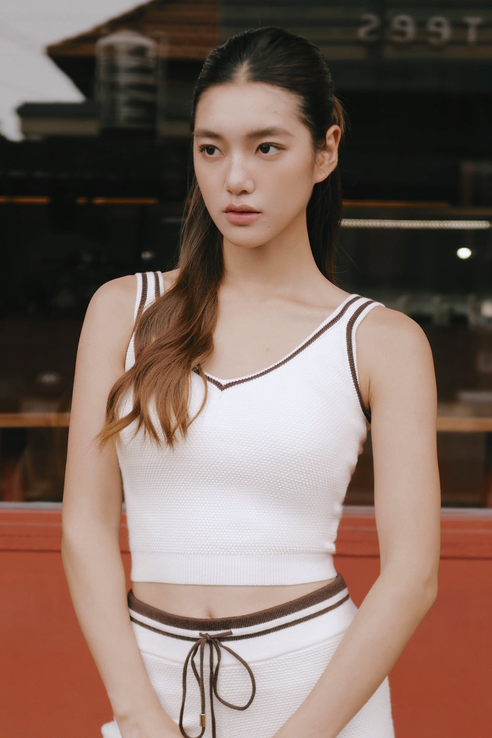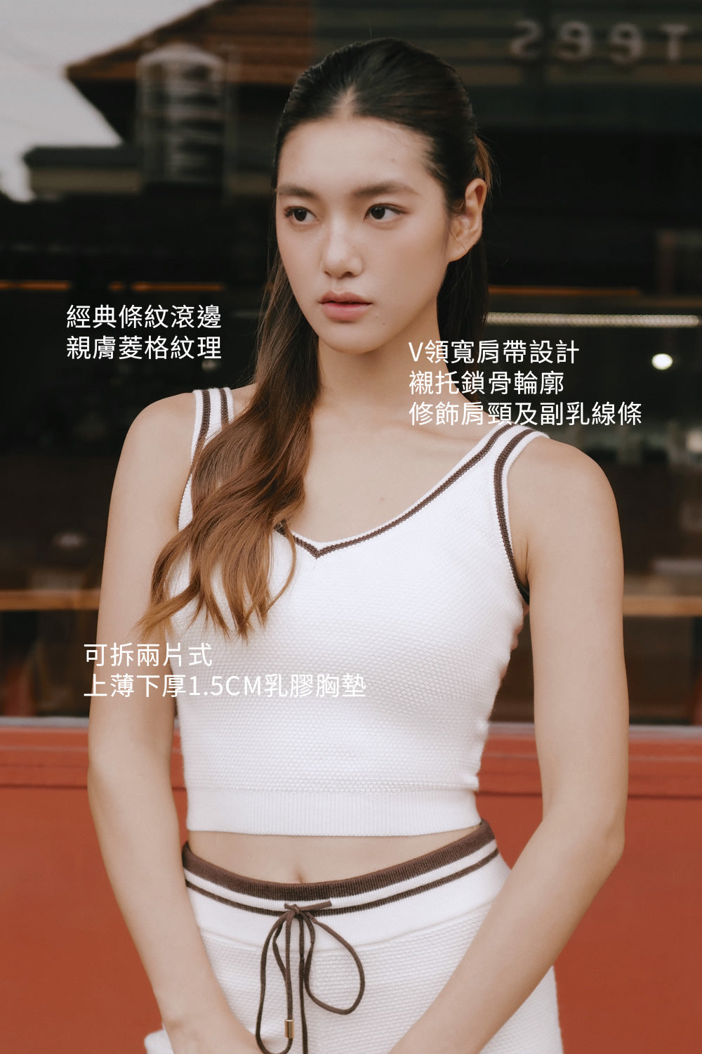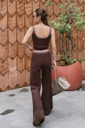 Afternoon Walk Tuck-Stitch Knit Contrast Trim V-Neck Wide-Strap BraTop