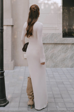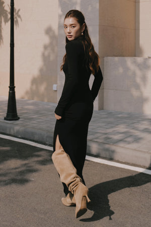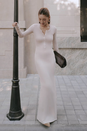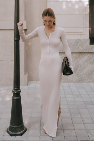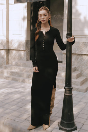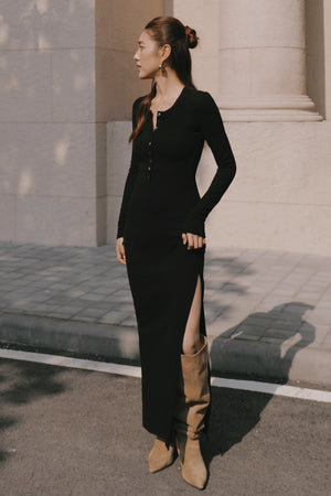 Elegant Rib Warmth Long-Sleeve Buttoned-Bodice Side-Slit Dress