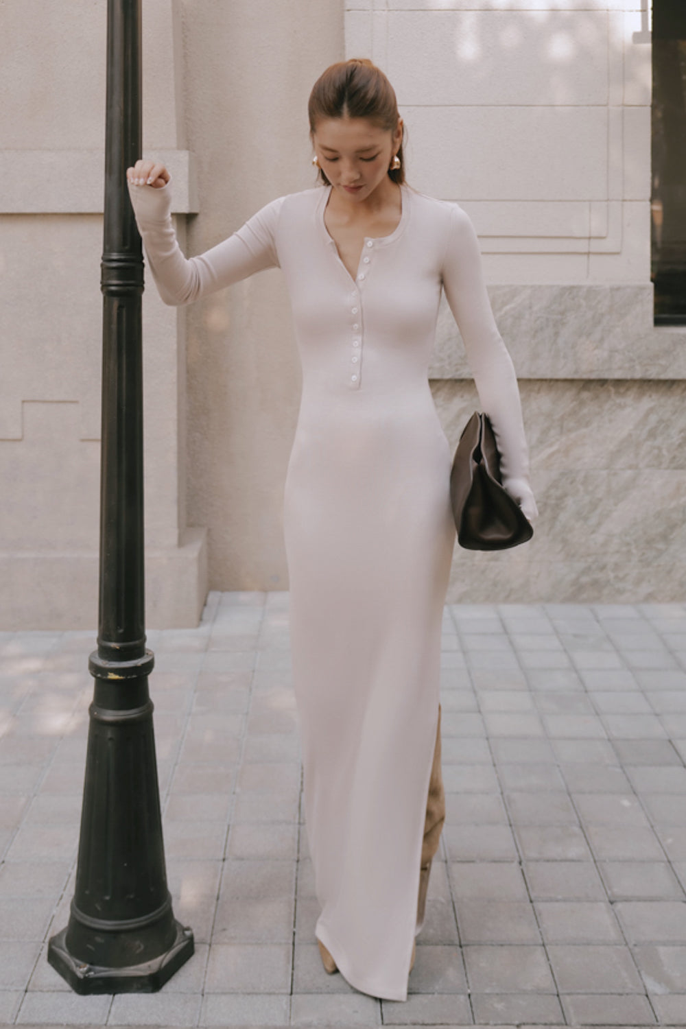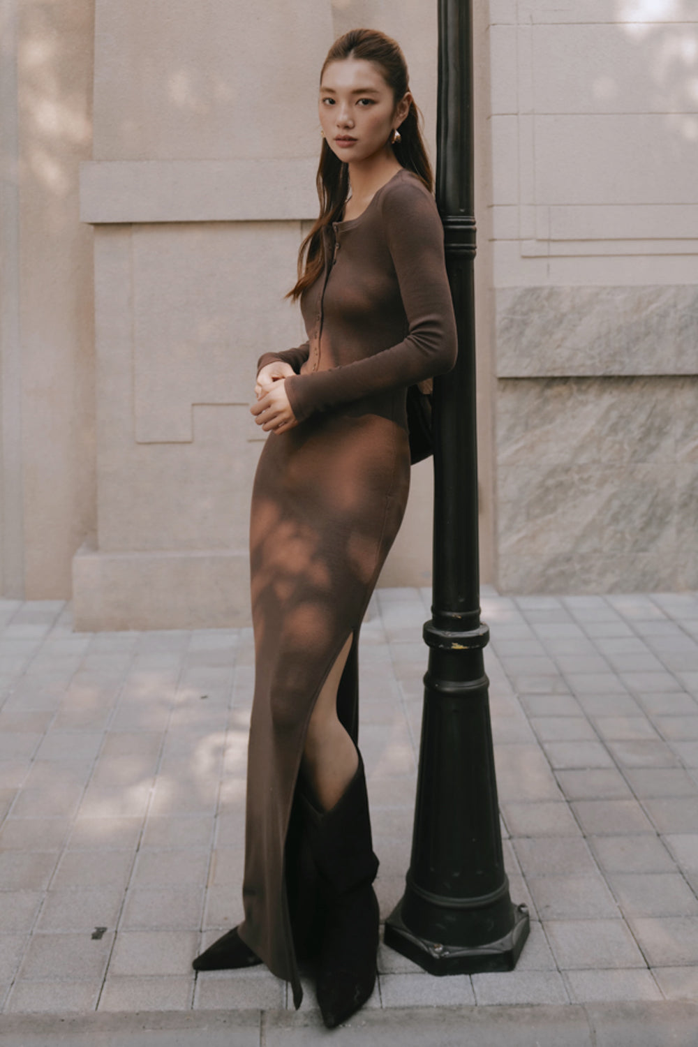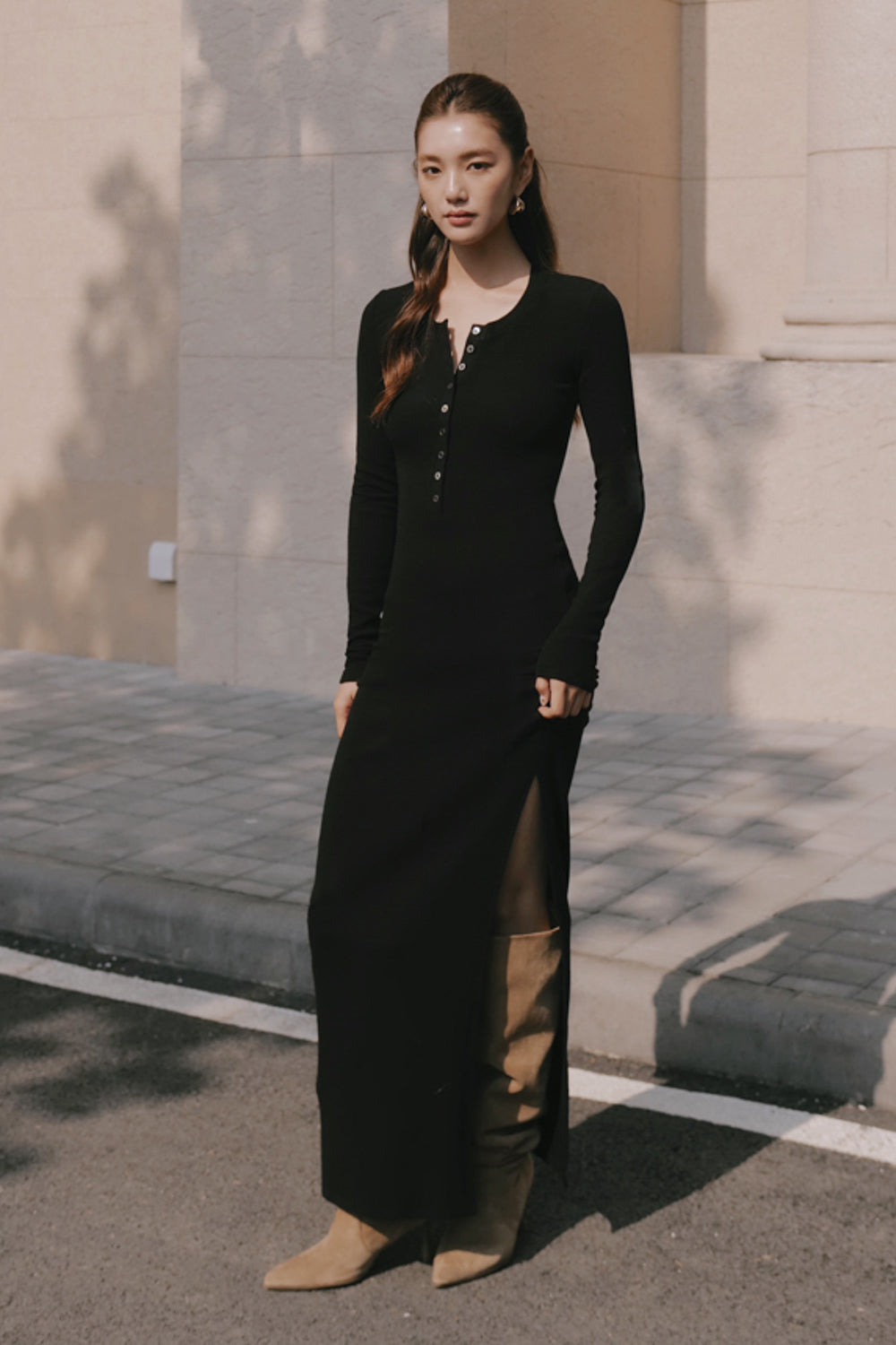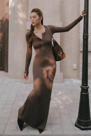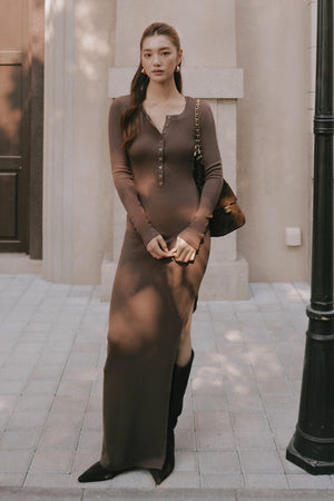 Home All Elegant Rib Warmth Long-Sleeve Buttoned-Bodice Side-Slit Dress