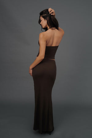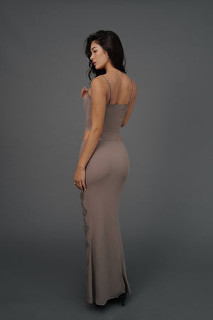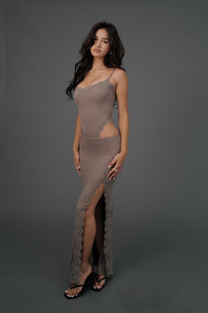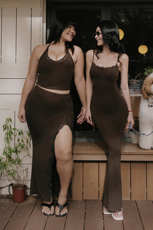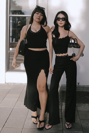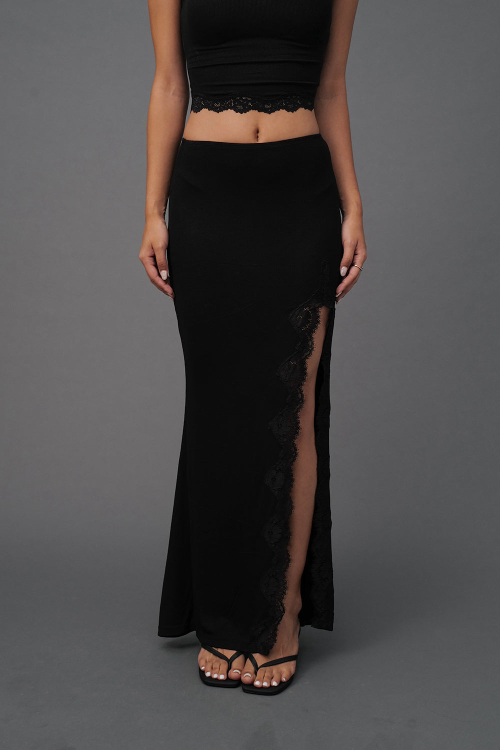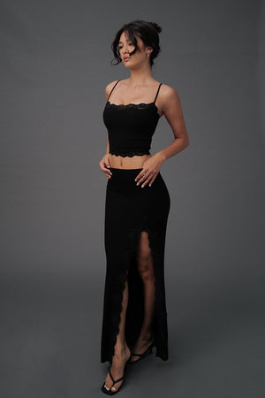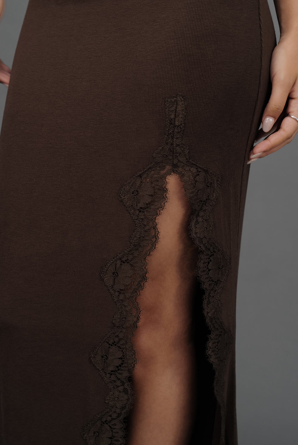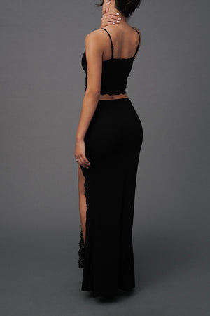 Elegant Rib Lace Trim Slit Maxi Skirt