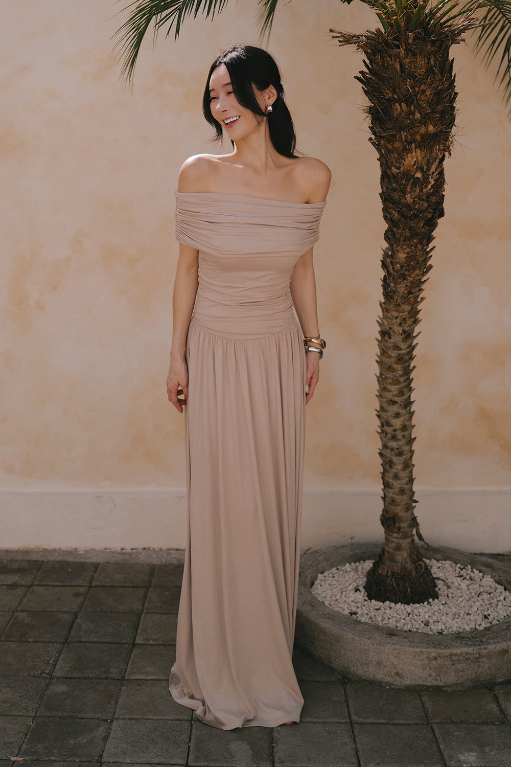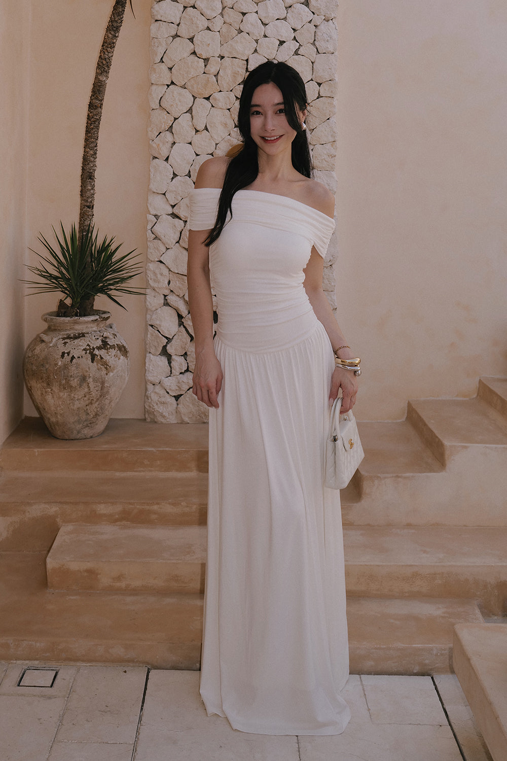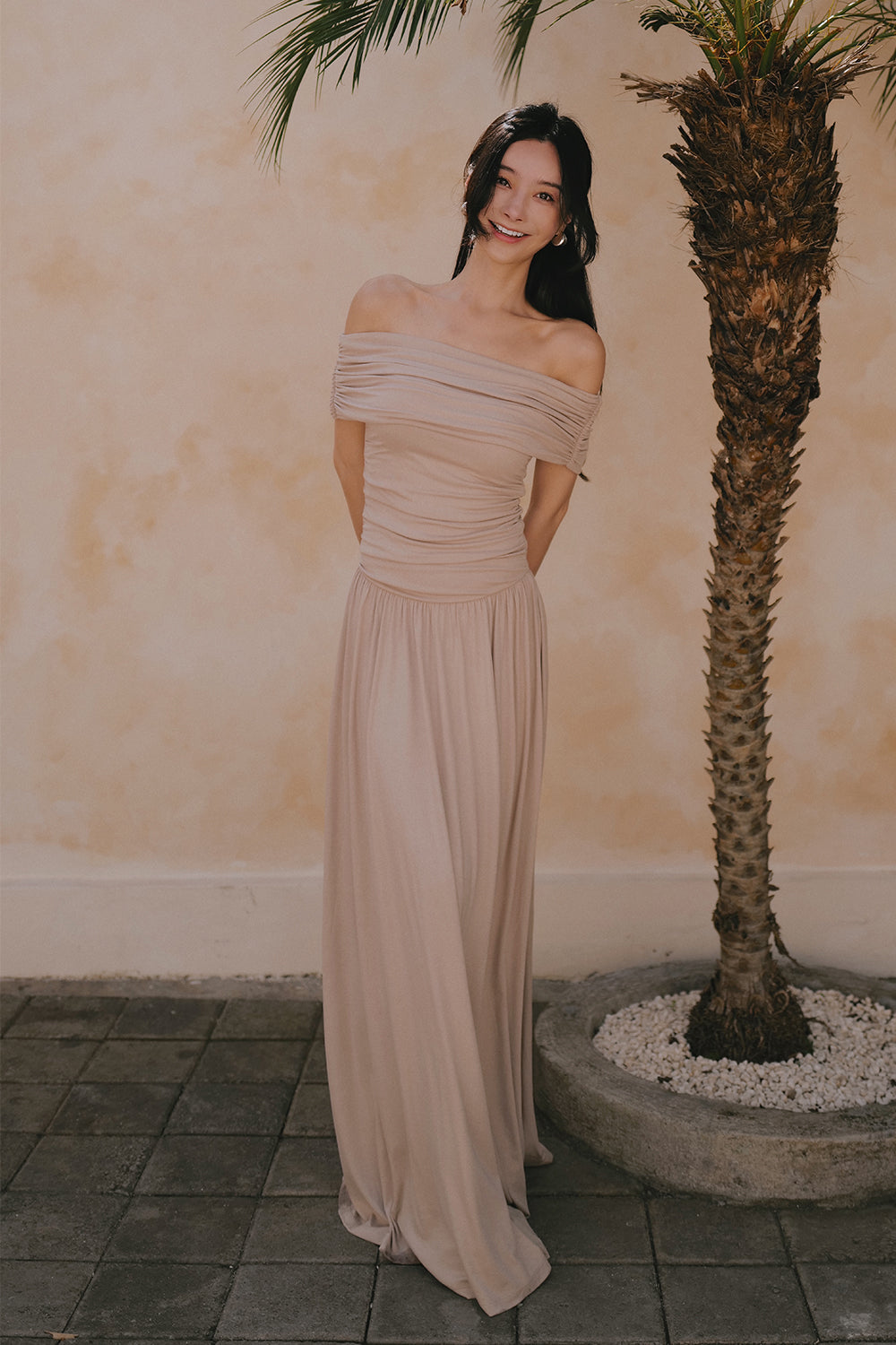 一字領皺皺襯墊長洋裝 Island Reverie Off-Shoulder Pleated Maxi Bra Dress