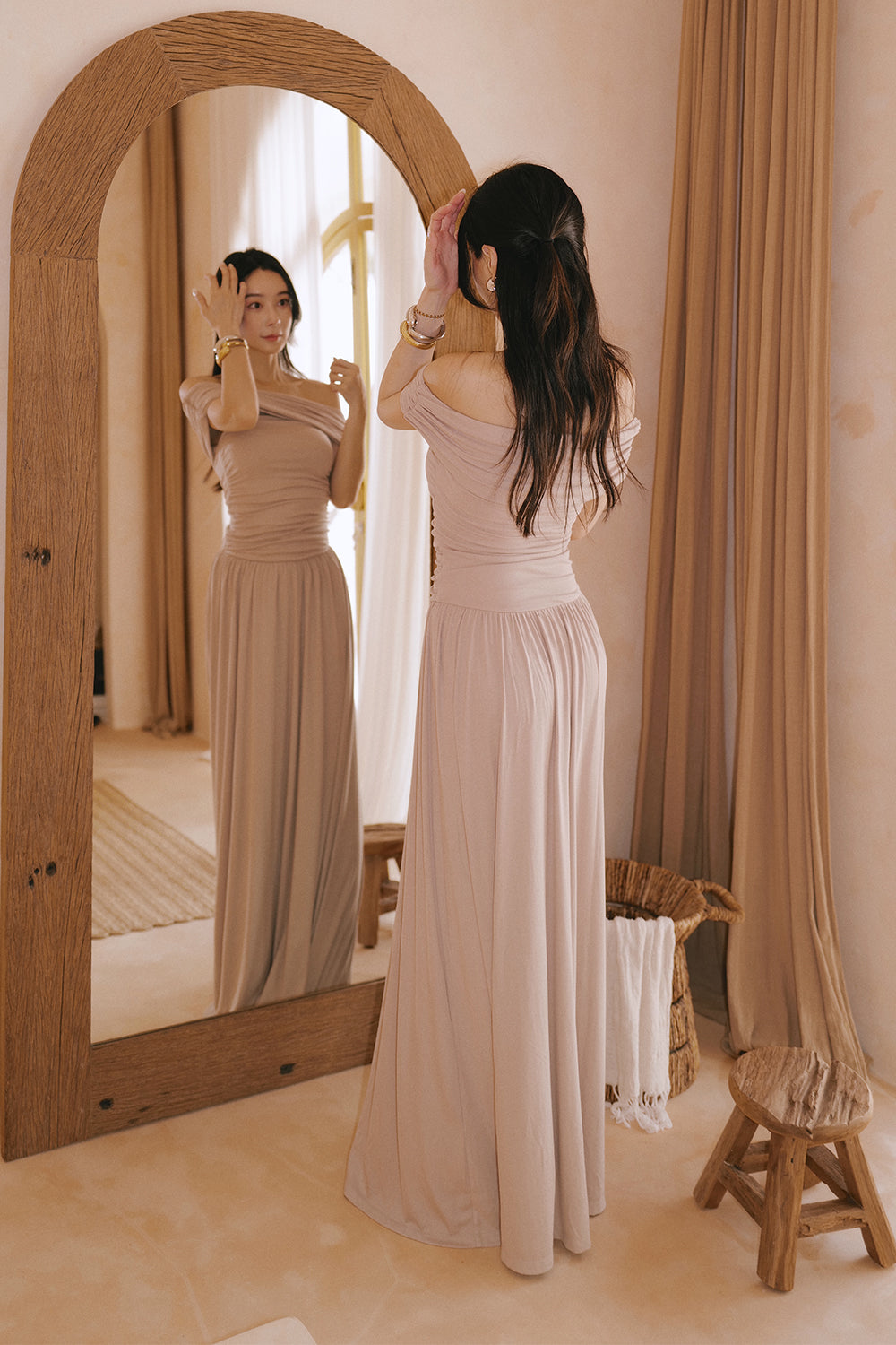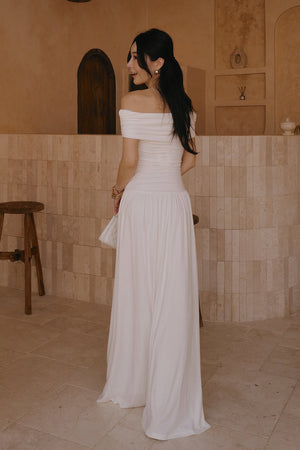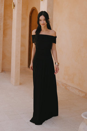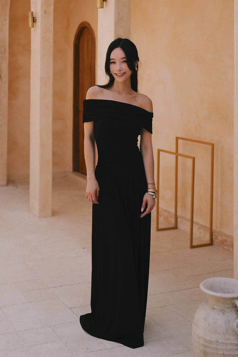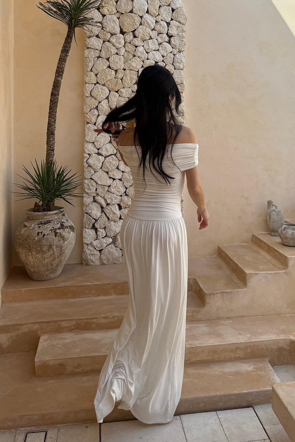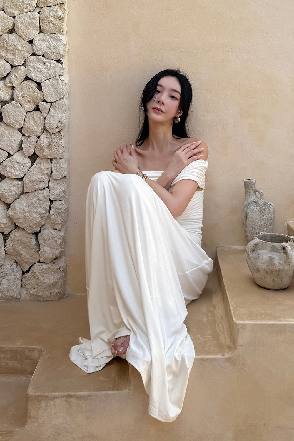 一字領皺皺襯墊長洋裝 Island Reverie Off-Shoulder Pleated Maxi Bra Dress