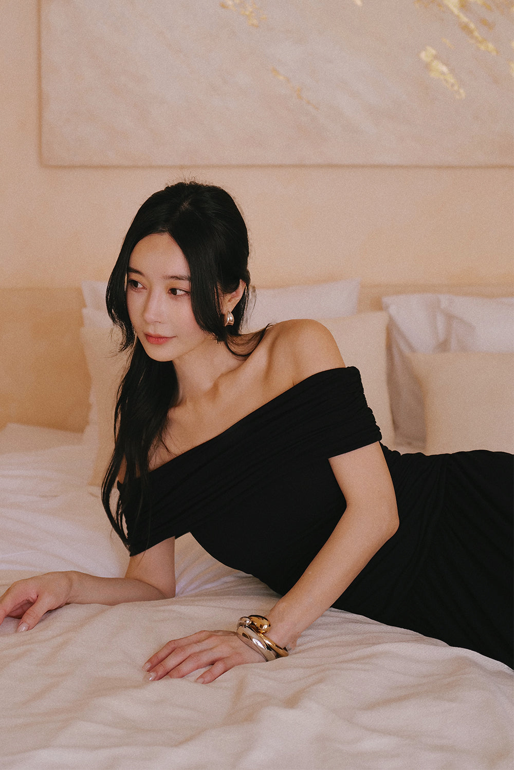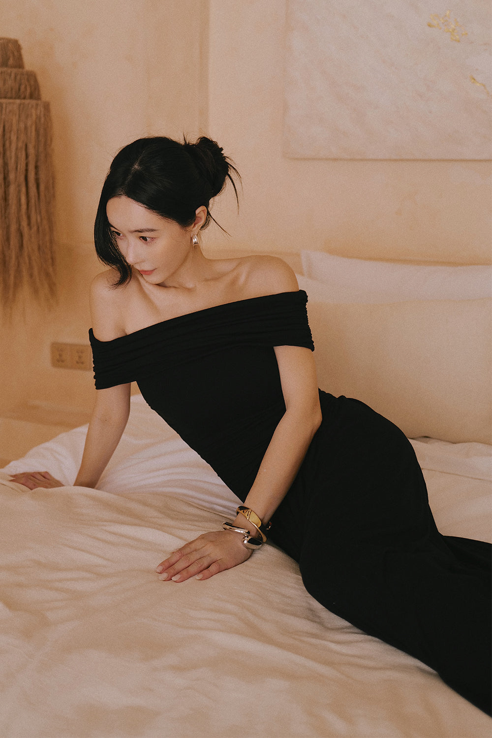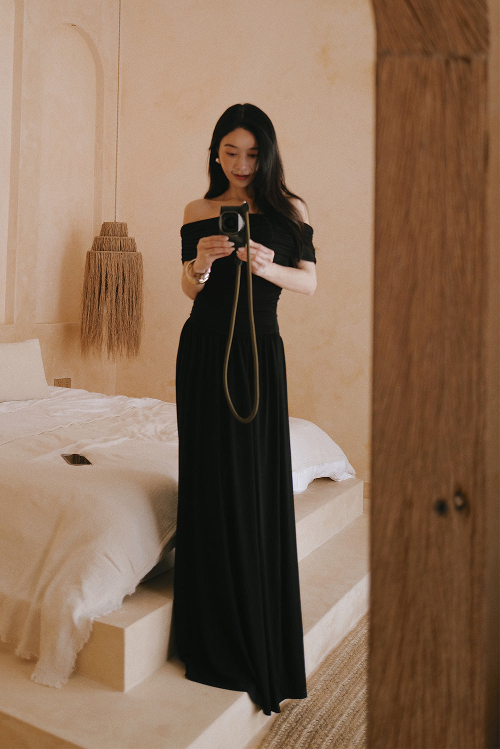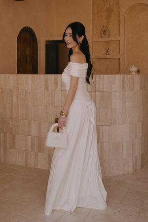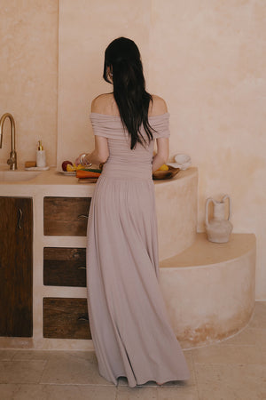 一字領皺皺襯墊長洋裝 Island Reverie Off-Shoulder Pleated Maxi Bra Dress