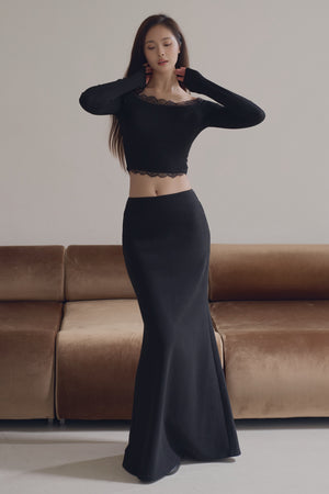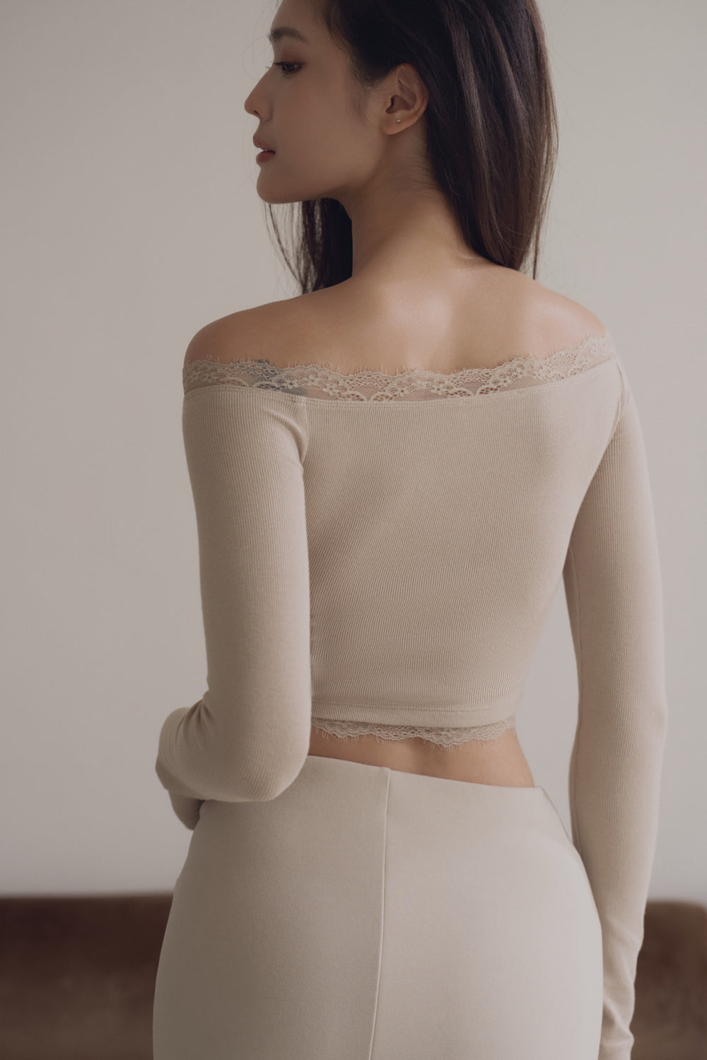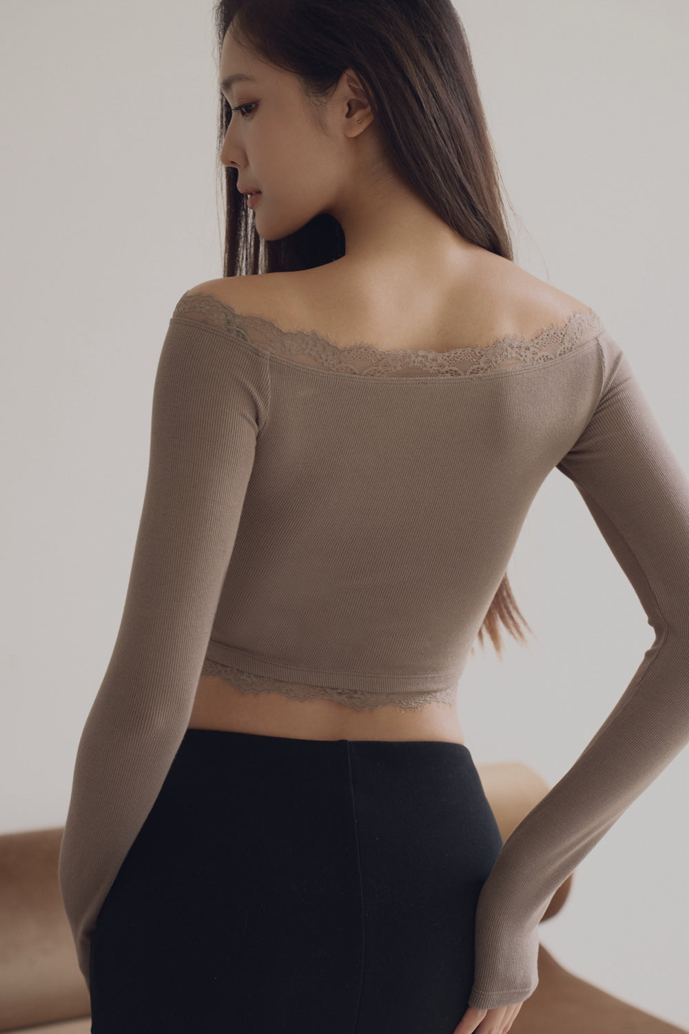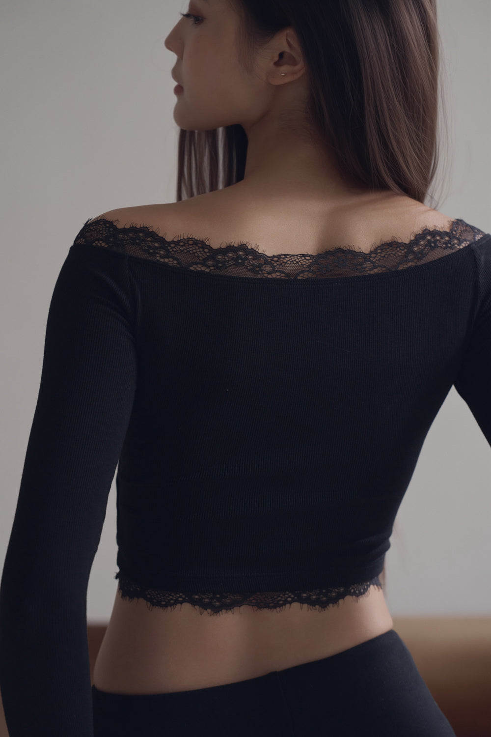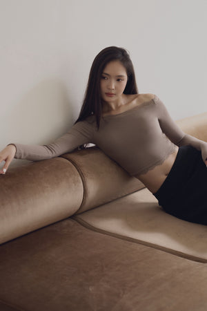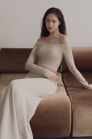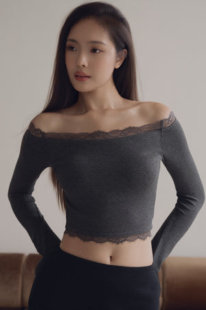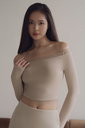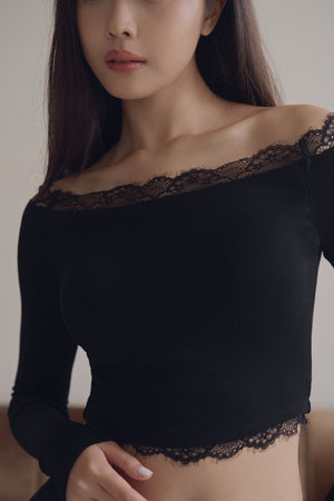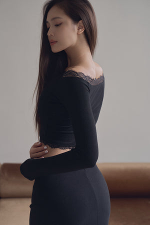 Elegant Rib Lace Trim Off-Shoulder Long Sleeve Bra Top