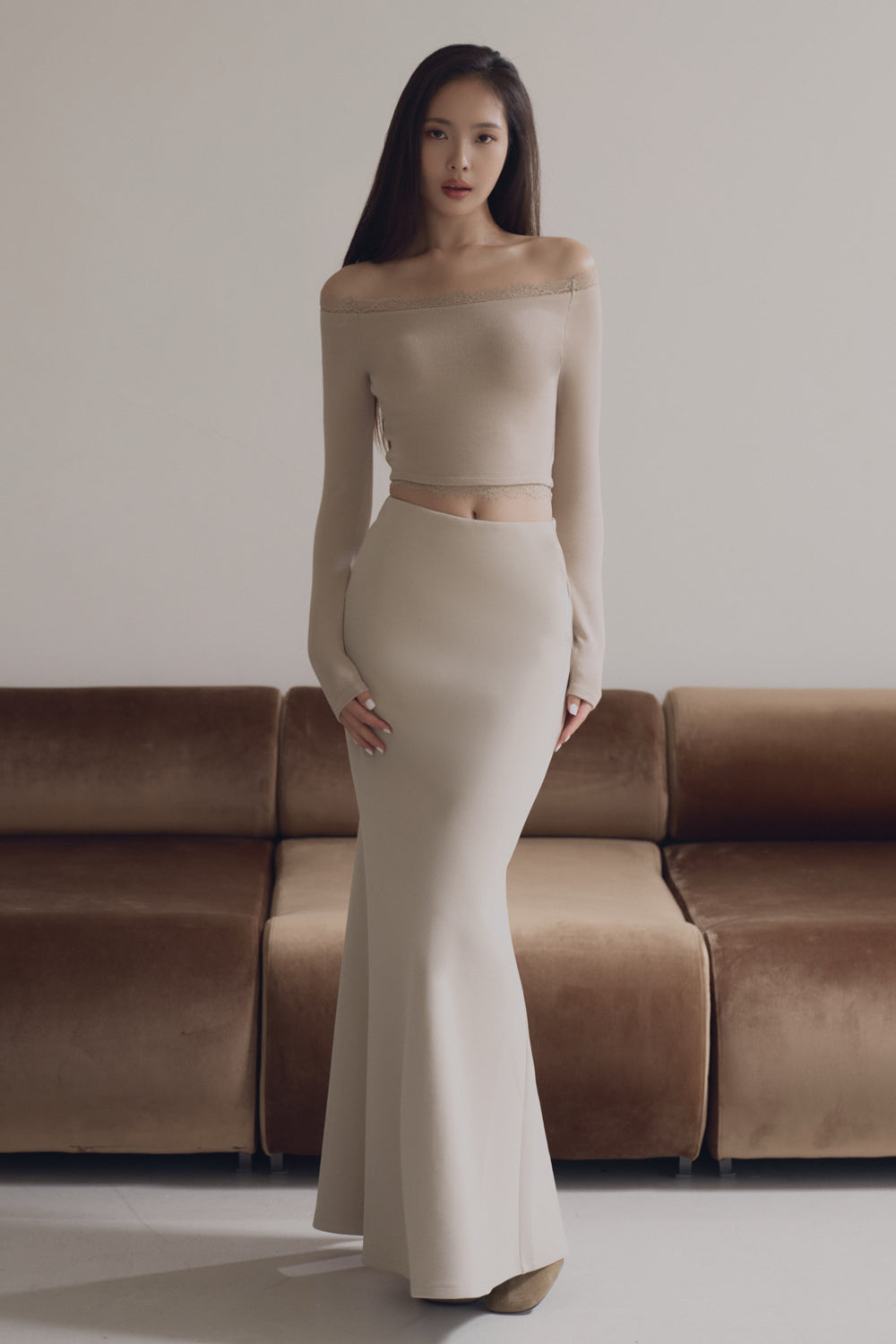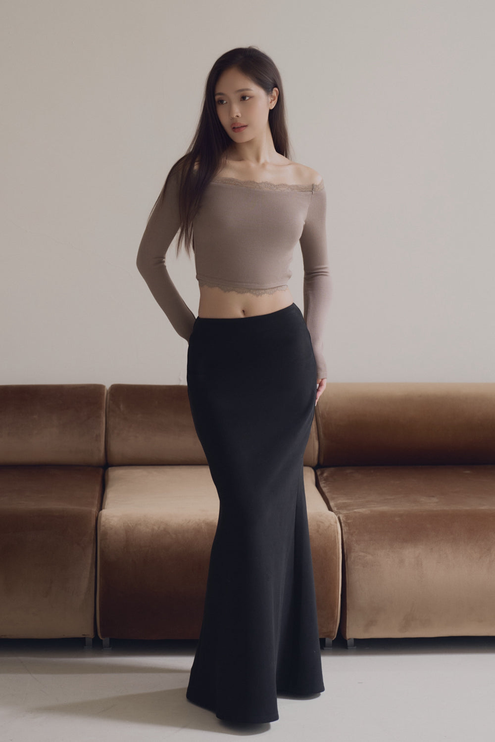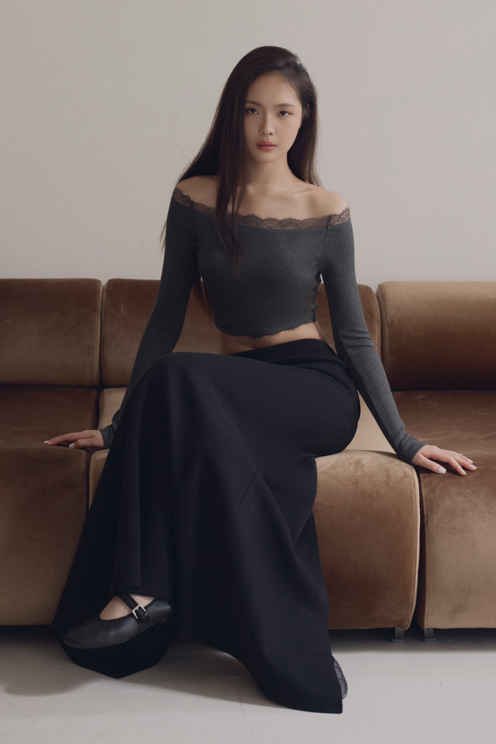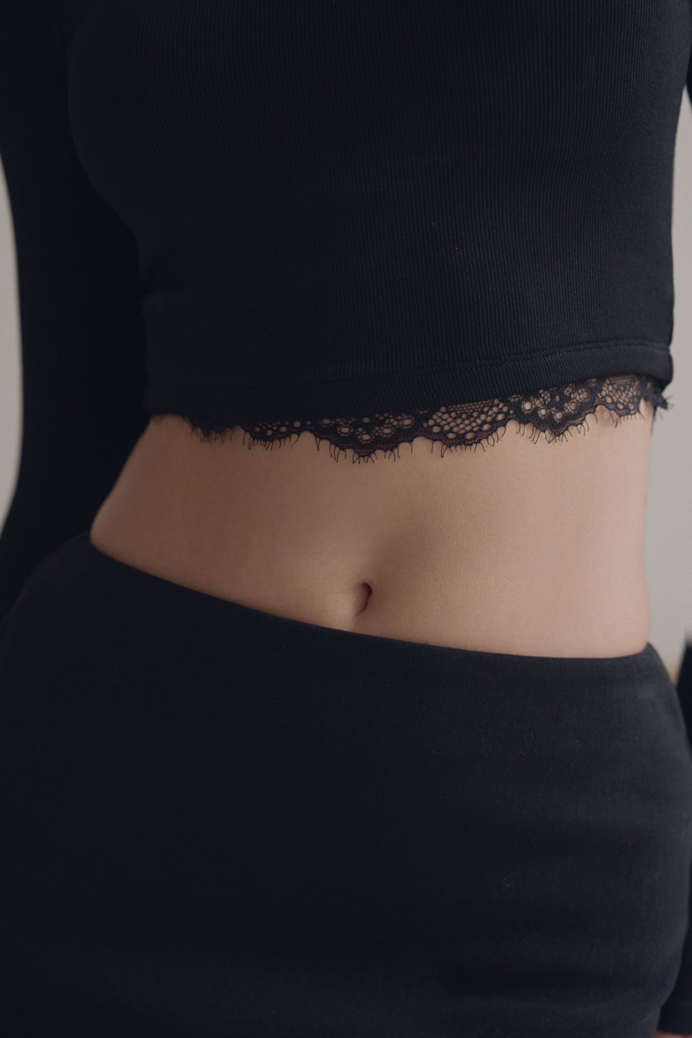 Elegant Rib Lace Trim Off-Shoulder Long Sleeve Bra Top