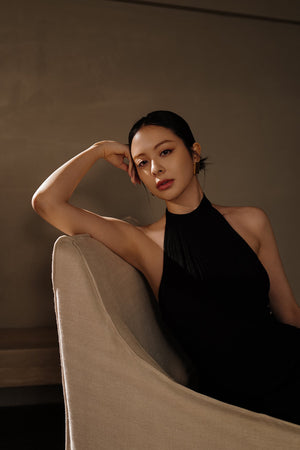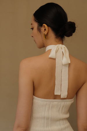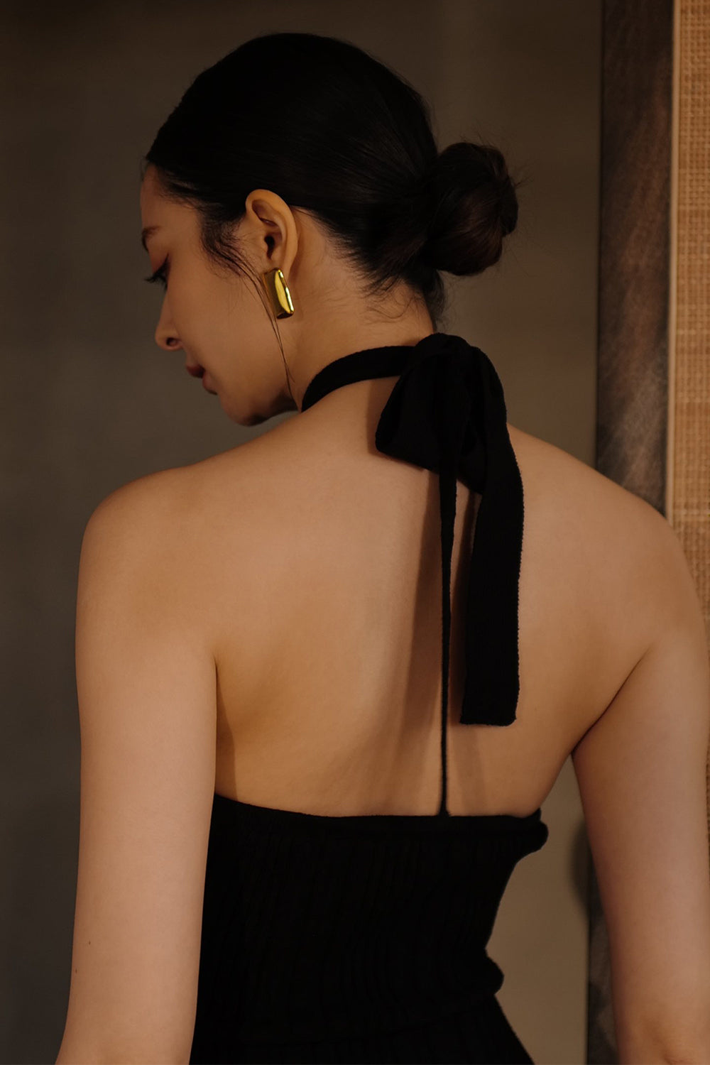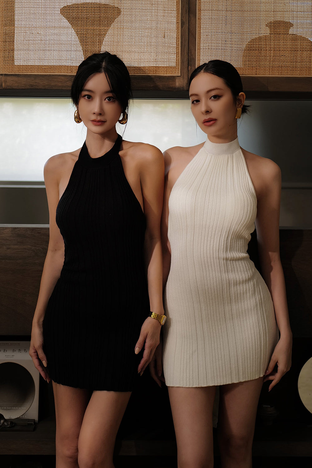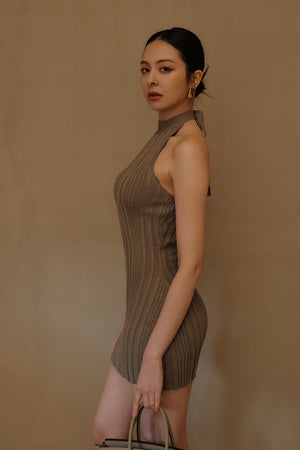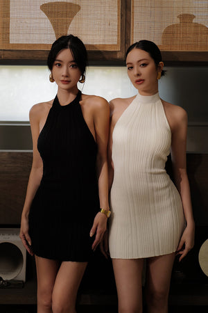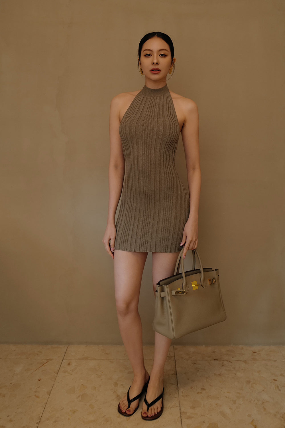 坑條針織繞脖綁帶襯墊短洋裝Wide Ribbed Knit Halter Mini Bra Dress