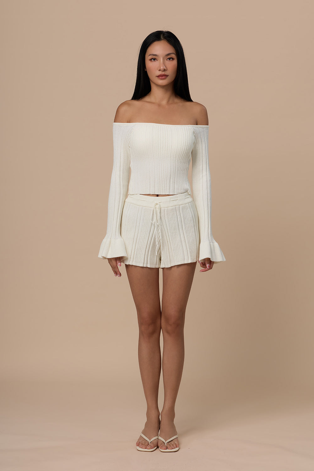 Home Collection|Breezy Knit Wide Ribbed Knit Ruffled Hem Off-Shoulder Long Sleeve BraTop