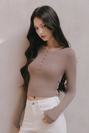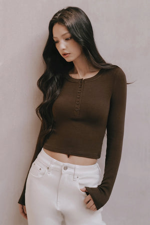 Elegant Rib Knit Press Button Long Sleeve Top