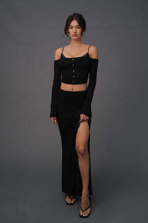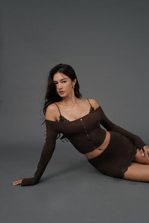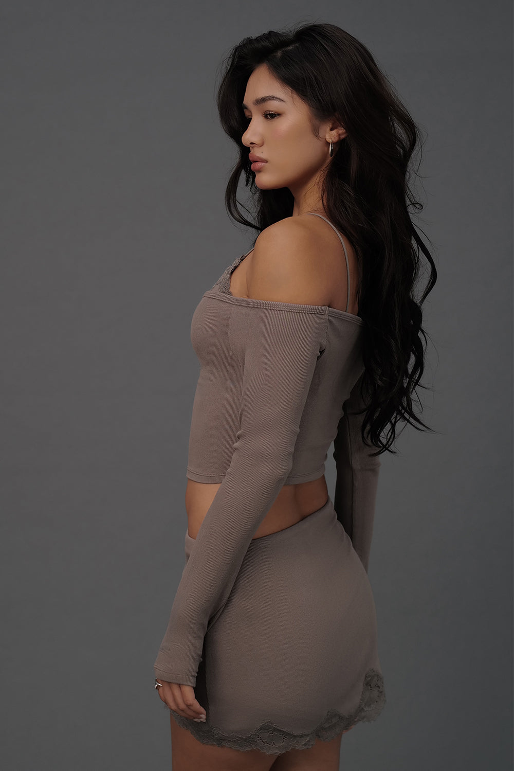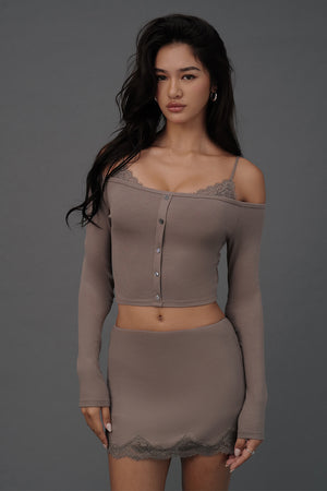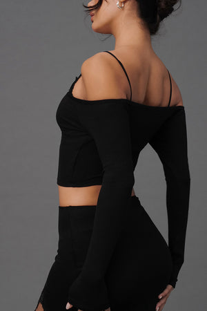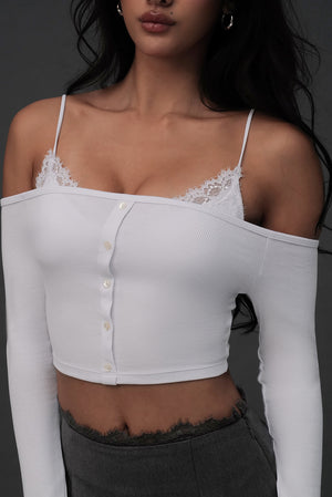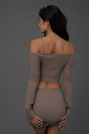 Elegant Rib Lace Trim Off-Shoulder Long Sleeve BraTop
