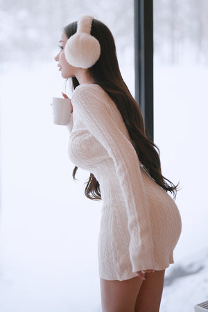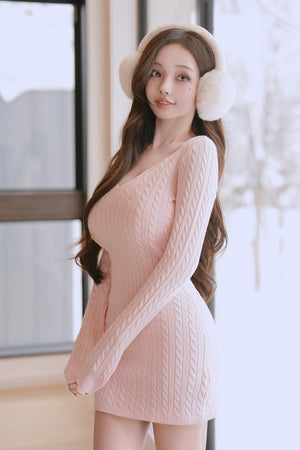 Gentle Touch Fine Cable Knit V-Neck Long-Sleeve Mini Dress