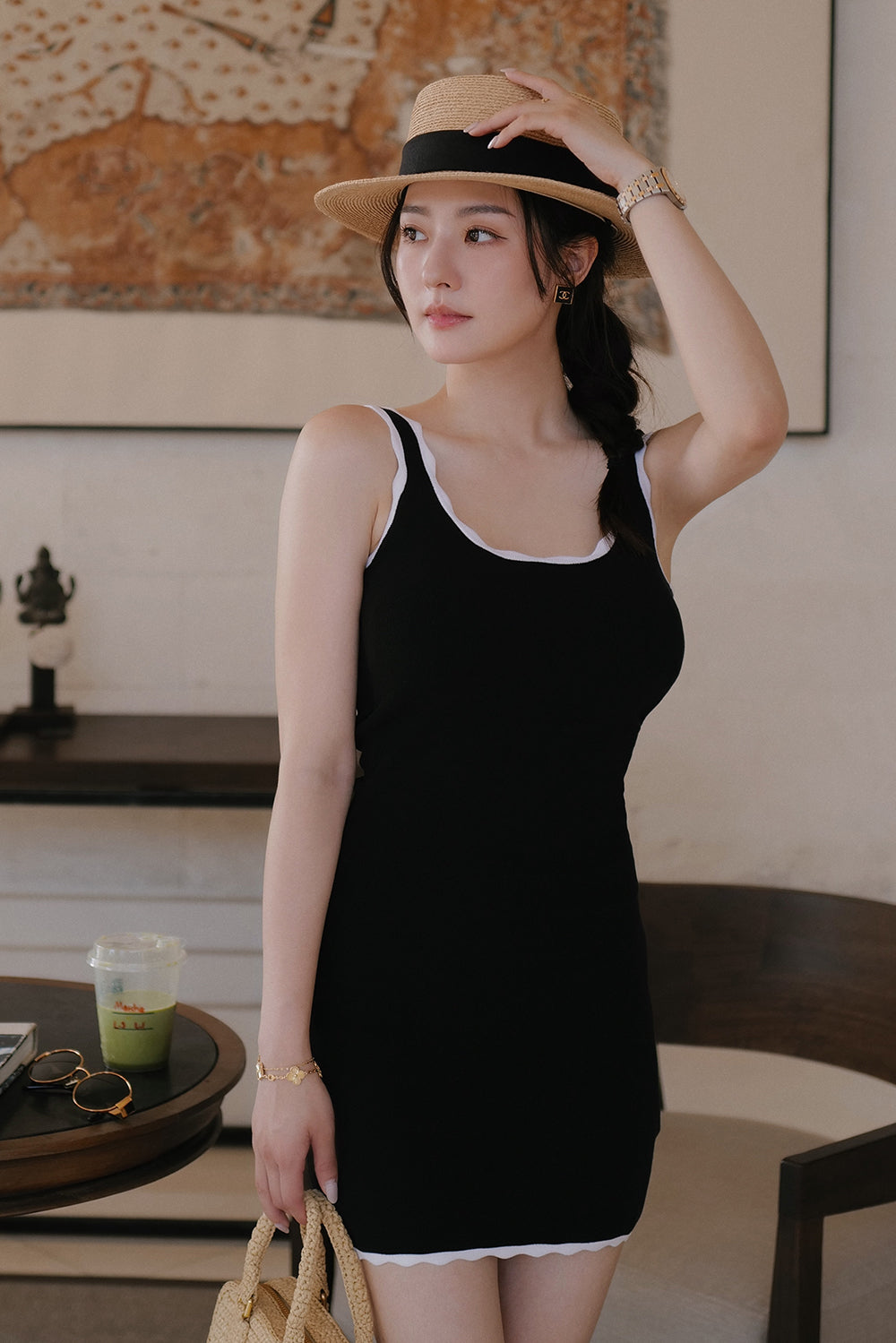 冰紗花邊寬肩帶襯墊短洋裝        Ripple Trim Knit U-Neck Wide-Strap Mini Bra Dress
