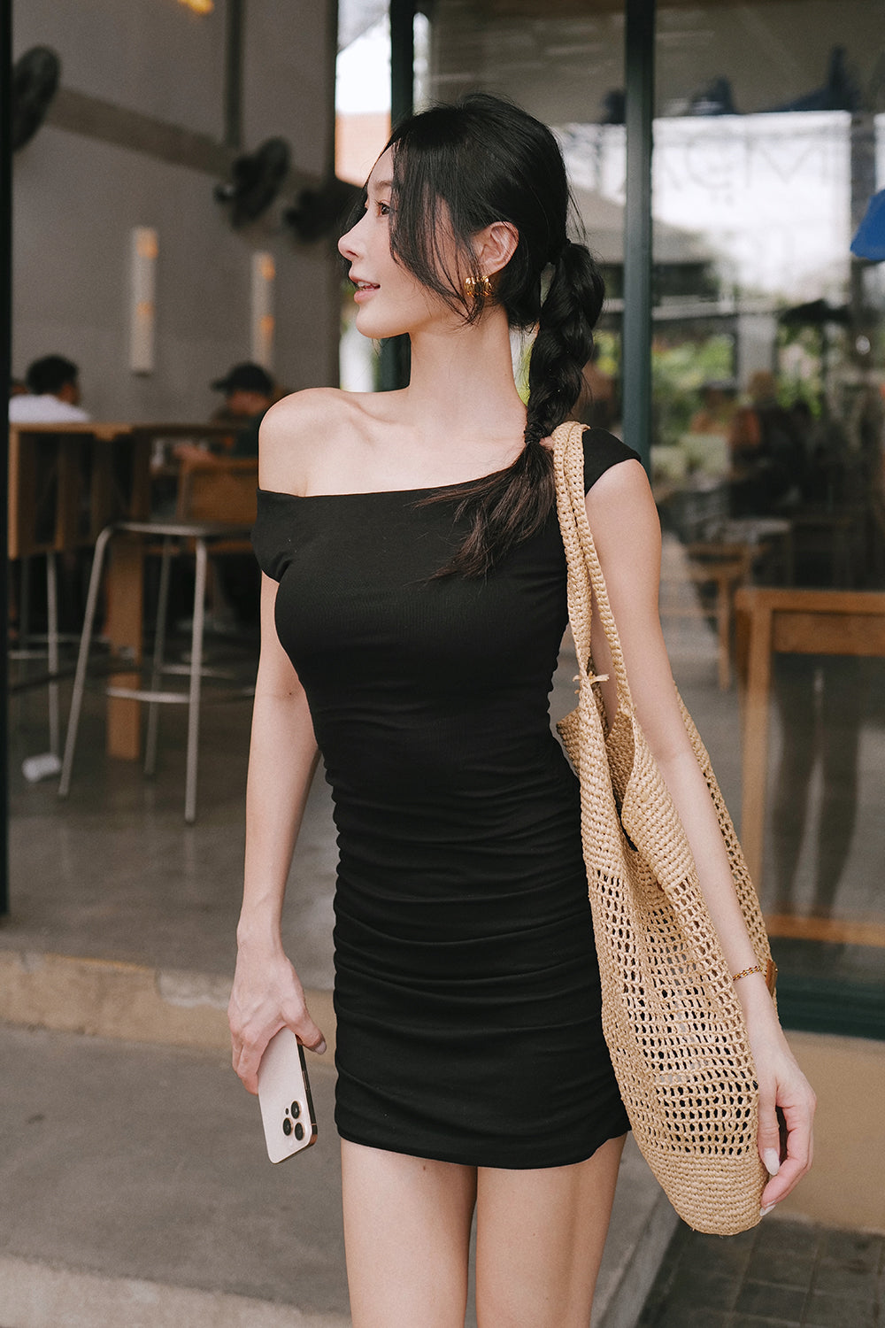 Soft Stretch Off-Shoulder Twist Rushed Mini Bra Dress