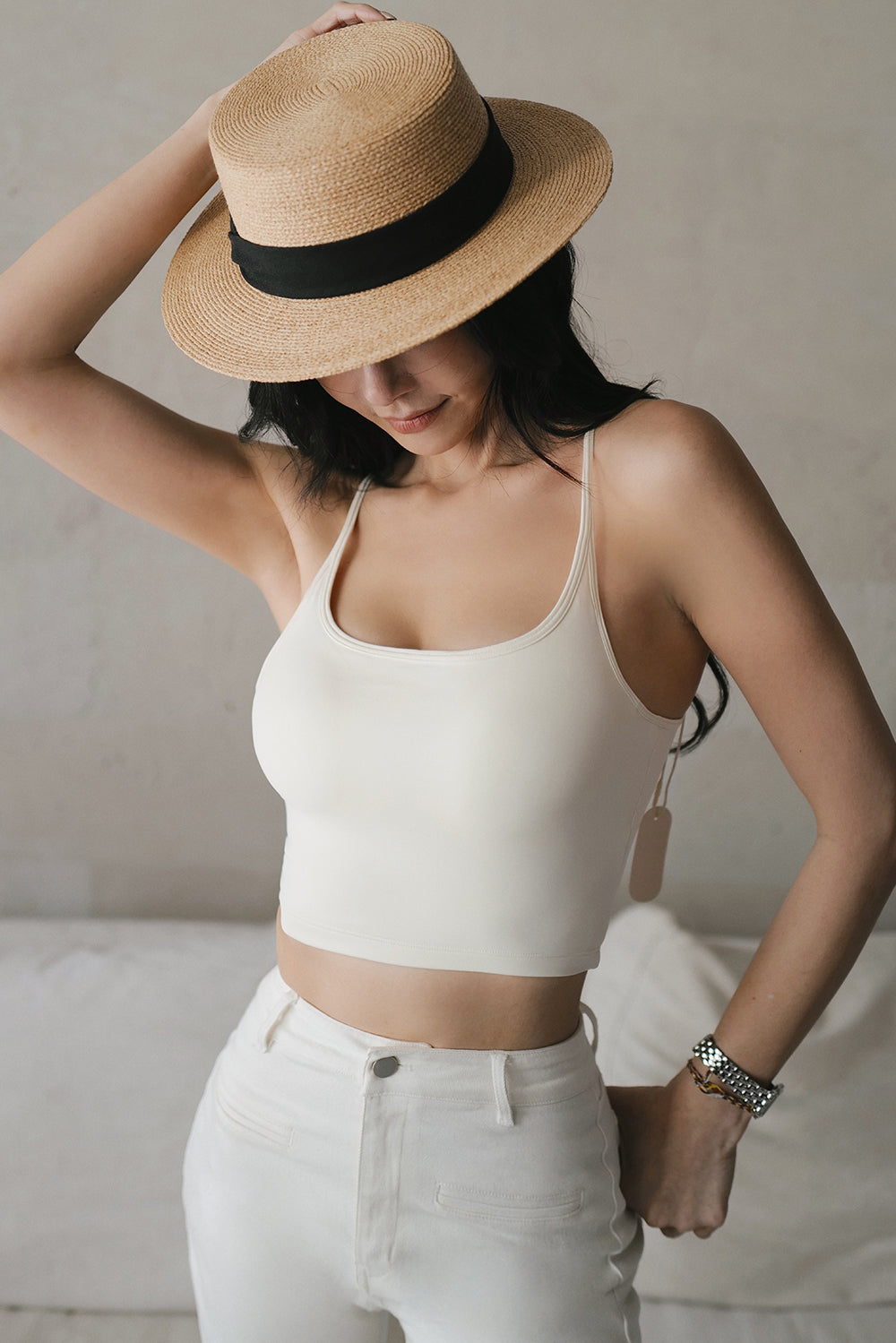 輕透細肩帶 BraTop,「AIRY 輕透系列」採用雙層⾯料,外層⾼彈力包覆,內層親膚柔順感,同時具抗菌除臭功能。基本款小背心卻超顯瘦,肩帶特殊縫線設計,降低壓迫感,內附不可拆兩片式胸墊,輕薄猶如舒芙蕾。