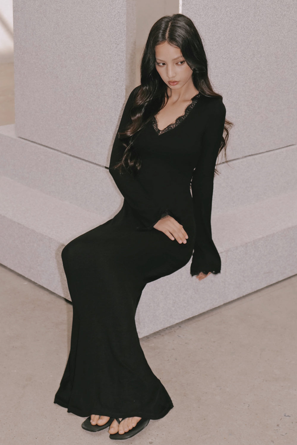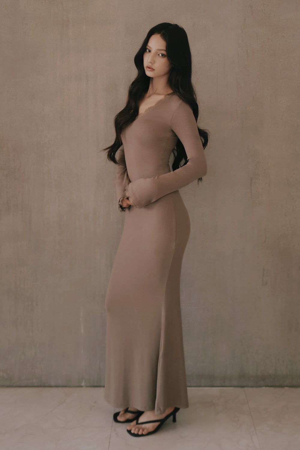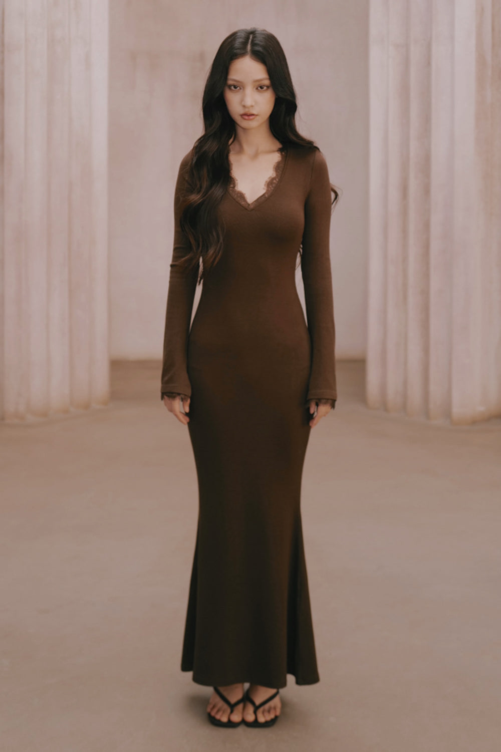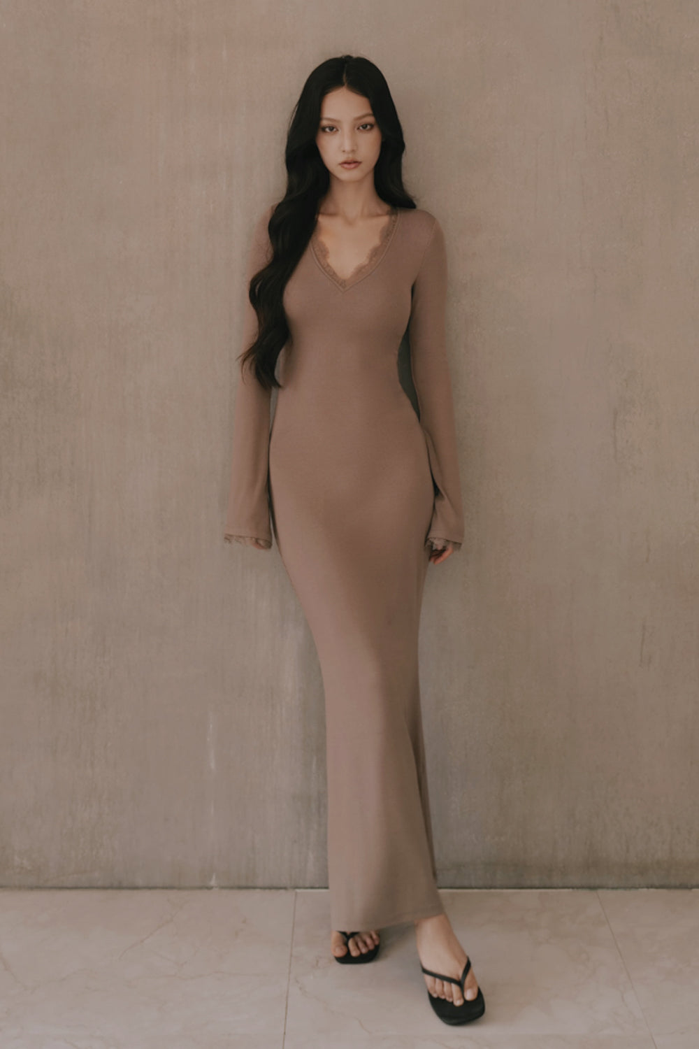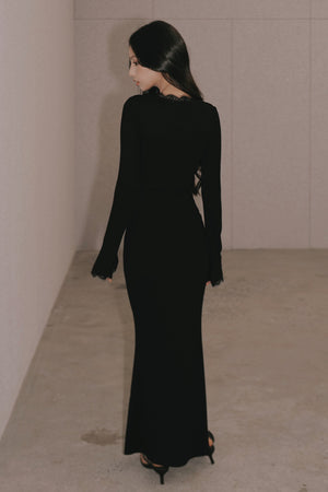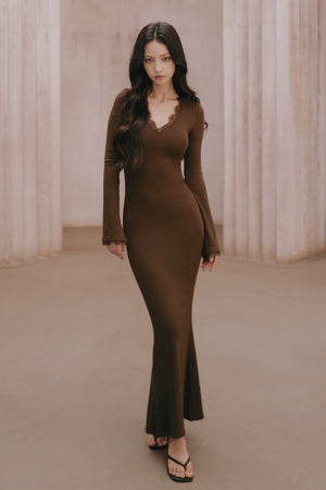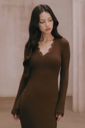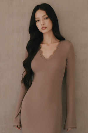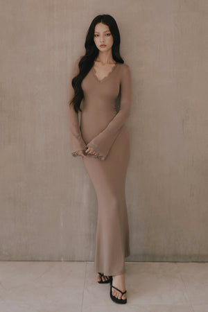 Elegant Rib Lace Trim V-Neck Long-Sleeve Maxi Bra Dress