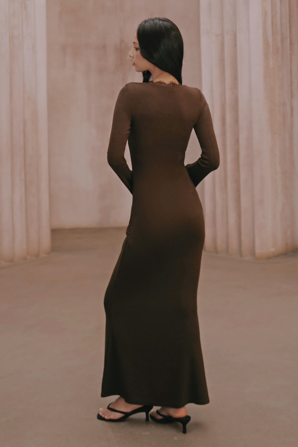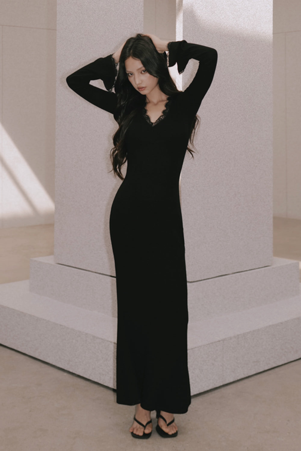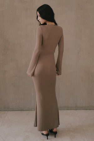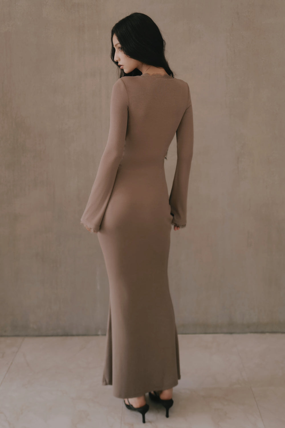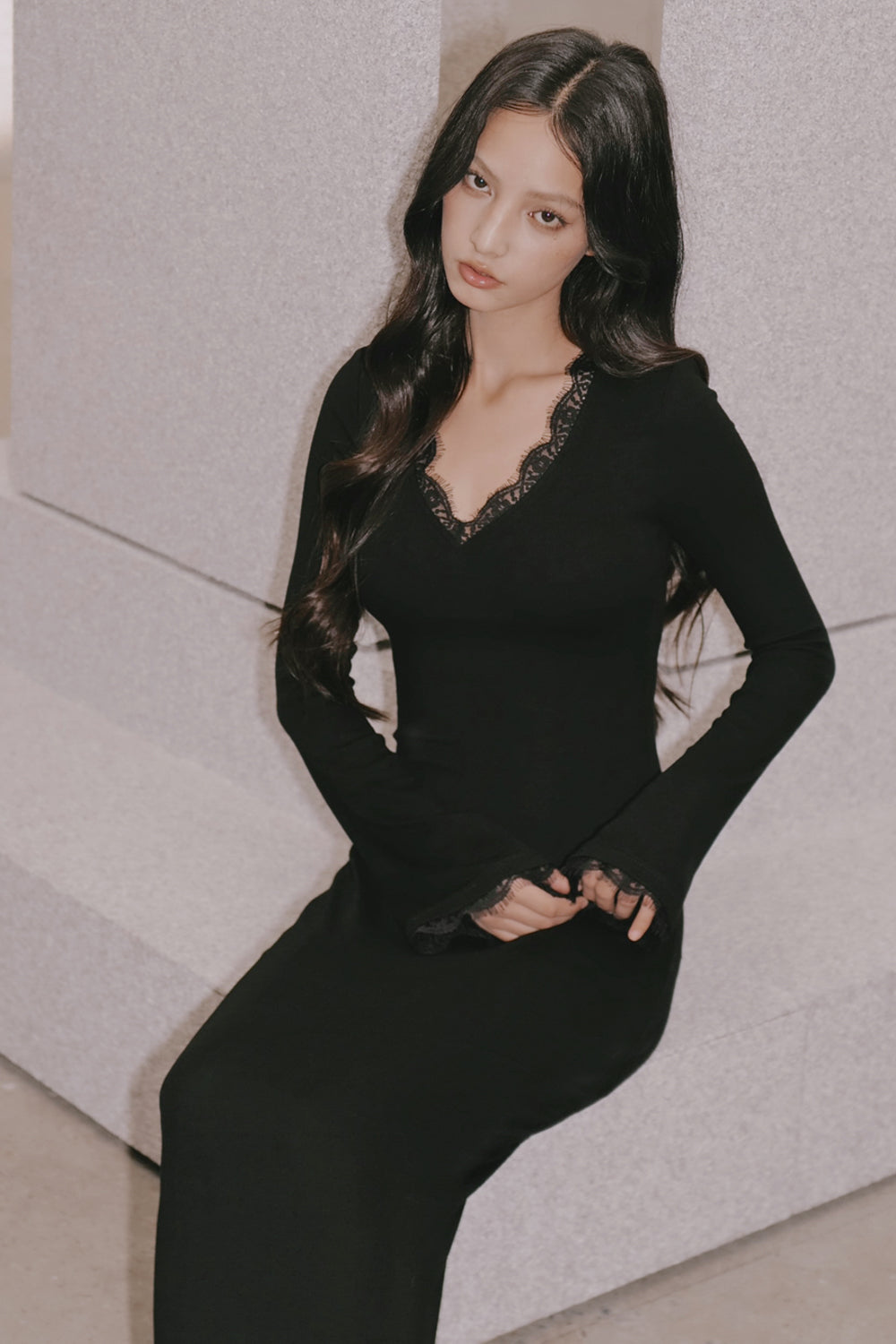 Elegant Rib Lace Trim V-Neck Long-Sleeve Maxi Bra Dress